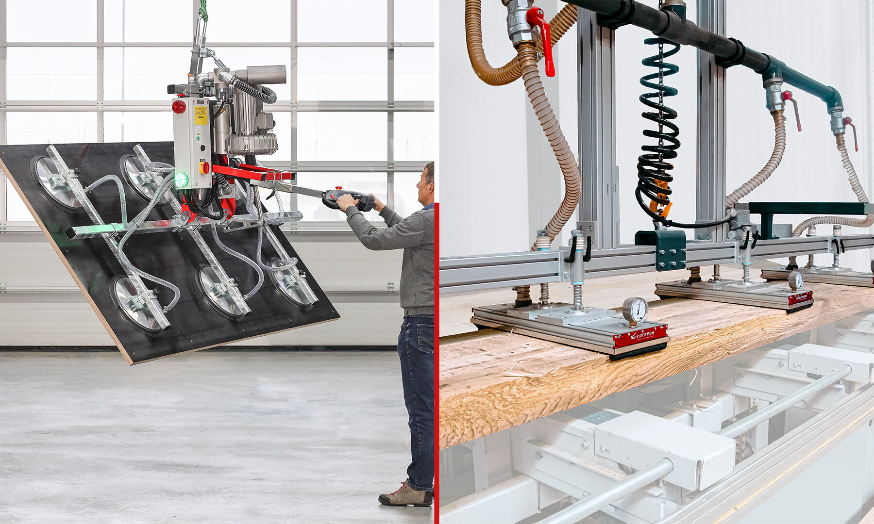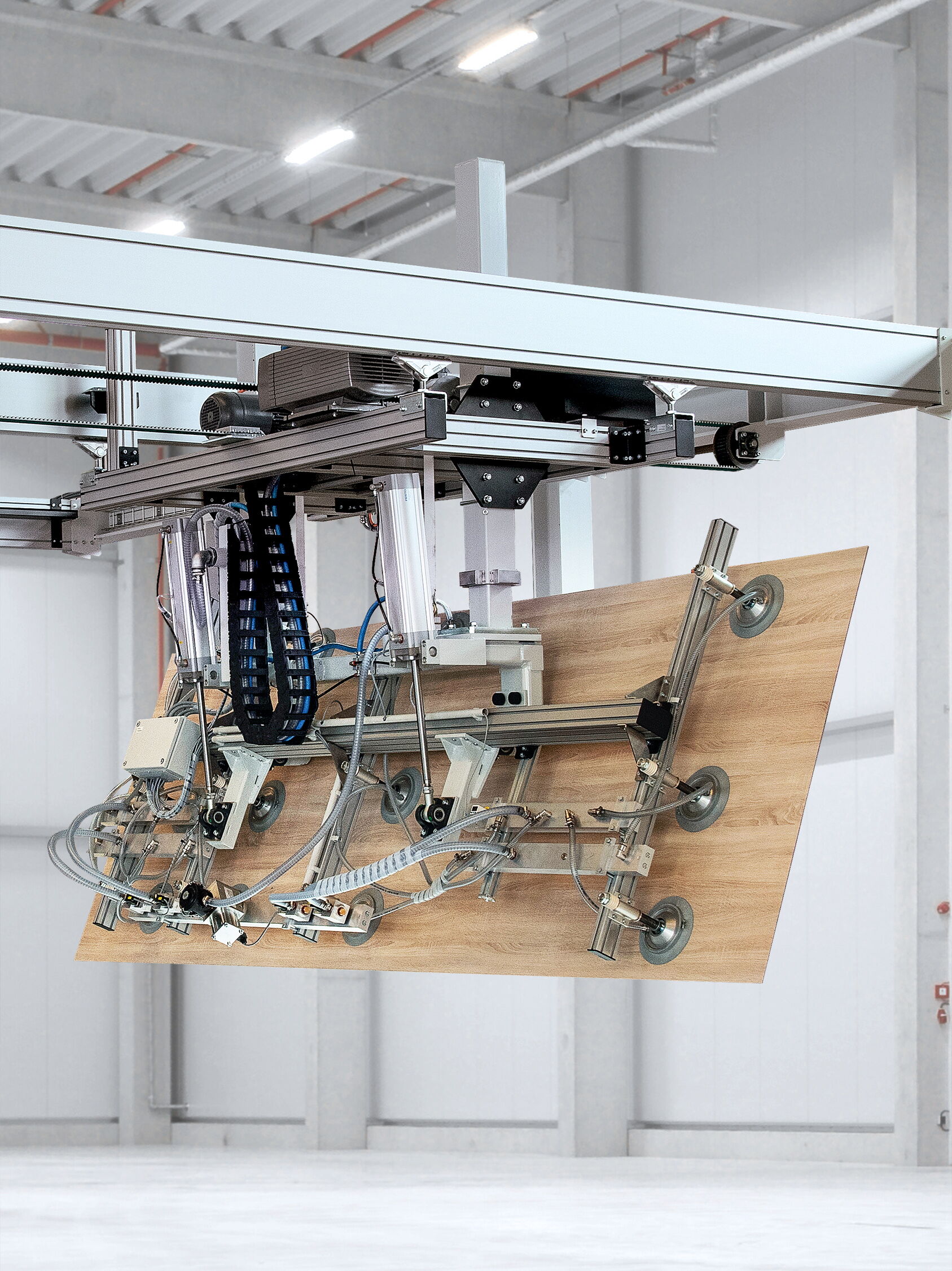 Notre technique de manipulation s'intègre parfaitement dans les processus souvent automatisés de la transformation du bois, que ce soit comme appareil de levage, portique ou extension de la robotique.