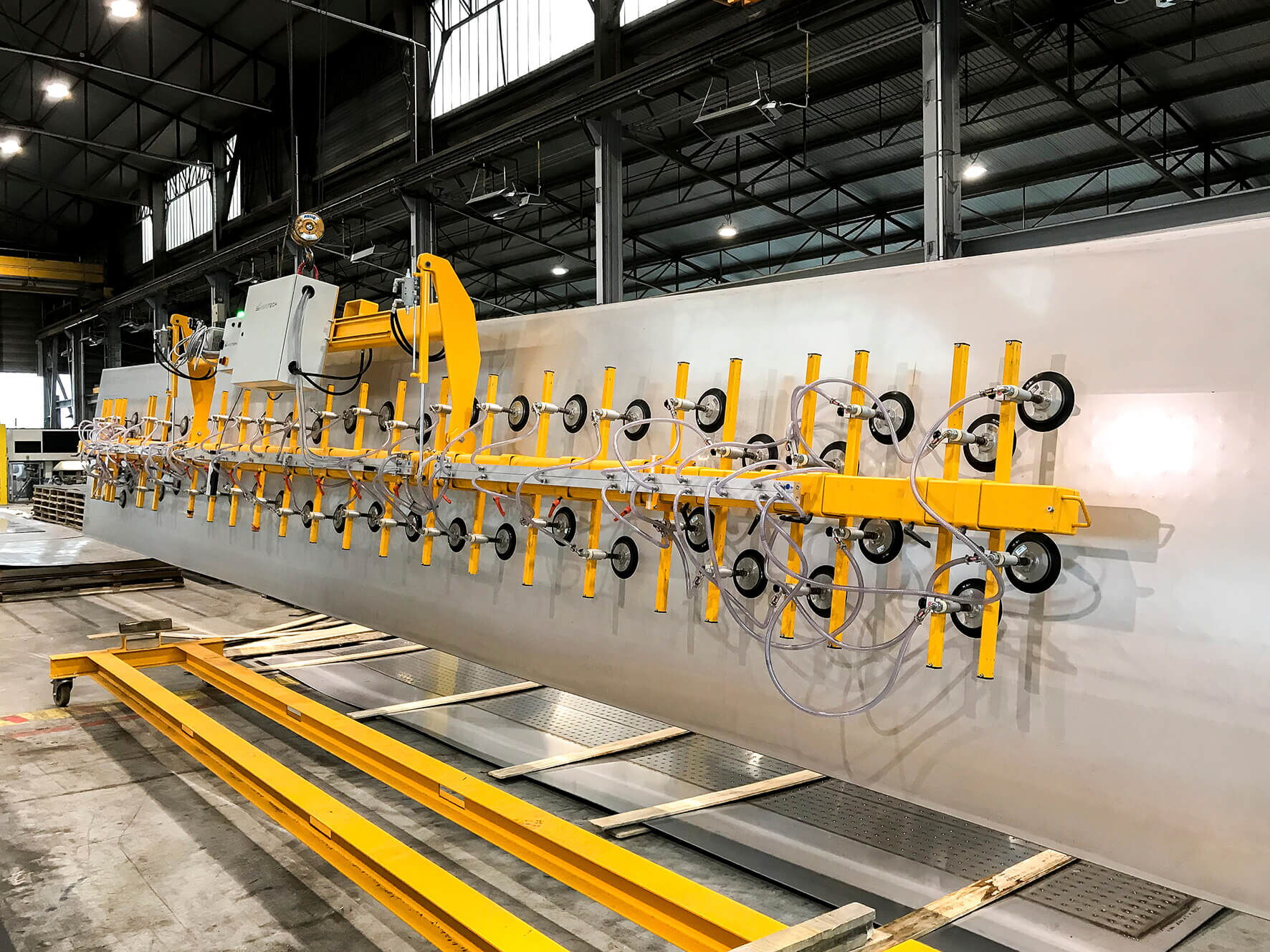 Unlängst hat ein 14 Meter langes Hebegerät die Hallen der euroTECH Handling GmbH verlassen. Der Vakuumspezialist lieferte das Gerät an Firma Ziemex mit Sitz in Sarre-Union Cedex, Frankreich. Das große eT-Hover Hebegerät ist in der Lage, Platten mit einer Gesamtlänge von 16 bis 18 Metern zu heben und um 90° zu schwenken.
