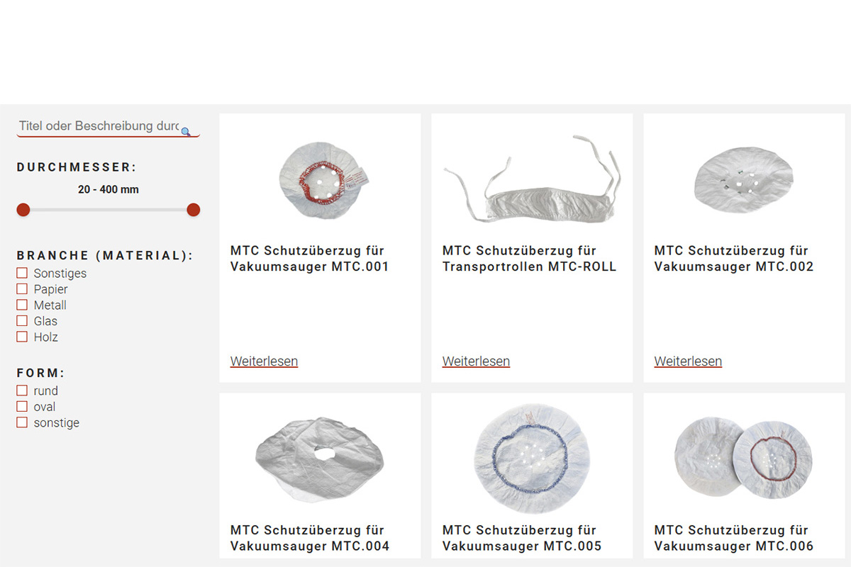 In der Produktauswahl finden Sie die geeigneten MTC Schutzüberzüge für Ihre Saugplattendichtungen oder Transportrollen.